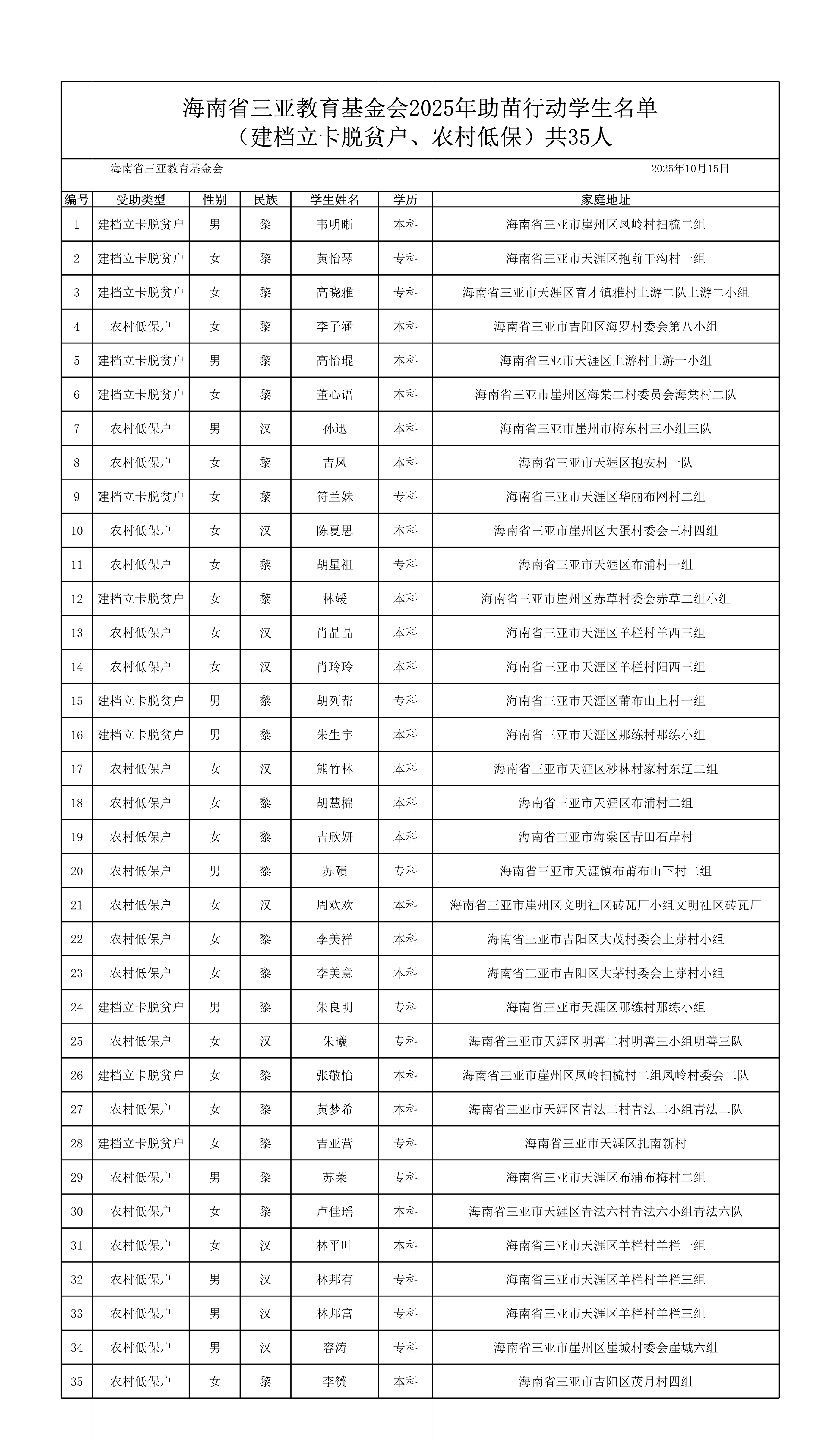 经过调查核实,现将海南省三亚教育基金会2025年“助苗行动”拟资助学生名单予以公示。本年度“助苗行动”共资助学生35名。公示时间7天,欢迎广大群众参与监督,如有遗漏、信息错误,请及时联系反馈。